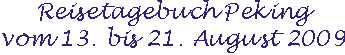 Damit auch die daheimgebliebenen Freunde über unsere Erlebnisse in Peking informiert waren, haben wir täglich eine E-Mail verschickt. Dieses "Reisetagebuch" soll nun auch alle anderen erfreuen: Donnerstag, 13. August 2009/Freitag, 14. August 2009: Seltsame Gestalten am Frankfurter Flughafen gesichtet Am Donnerstagnachmittag trafen wir am Frankfurter Flughafen ein, um pünktlich einchecken zu können für unseren Flug nach Peking.