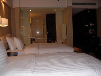 Gegen 14 Uhr Pekinger Zeit (8 Uhr in Deutschland) sind wir (Sharon, Sylvia und ich sowie der Rest der deutschen Truppe) wohlbehalten in unserem Hotel angekommen. Das Zimmer war sehr schön - insbesondere der freie Blick vom Bett zum Klo ;-) Aber: Es gibt einen Vorhang im Badezimmer, den man herunterlassen kann.