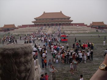 Dabei muss man wissen, dass man sich zunächst einen dünnen Pfannkuchen nimmt, auf diesen legt man Frühlingszwiebeln und Gurkensticks und dazu dann Streifen von der Pekingente, die vorher in Sojasauce getunkt wurden. Anschließend wird der Pfannkuchen zusammengerollt, unten zugeklappt und man isst das Ganze mit der Hand. Lecker, mmmh! Auf die Suppe, die es hier in China nach dem Hauptgericht gibt, haben die meisten dann lieber verzichtet. Die mutigen "Vorkoster" konnten auch nur von einem faden Geschmack berichten. Morgen gibt's dann einen Ganztagsausflug zur Verbotenen Stadt, dem Kaisertempel und dem Himmelstempel. Für den Abend wurde uns noch spontan der Besuch einer Kung-fu-Show angeboten. Wir sind gespannt. Dienstag, 18. August 2009: Alles "hao hao" in Beijing So langsam gewöhnen wir uns an die chinesische Sprache. Nicht nur, dass wir inzwischen die Begrüßung beherrschen - nein, unser Reiseführer gibt uns bei den Busfahrten immer noch einen kleinen Sprachkurs mit auf die Reise. Davon sollt auch Ihr Daheimgebliebenen nicht verschont bleiben ;-) Also, sprecht mir nach: ni hao = Hallo Unser Tag war wieder ausgefüllt mit vielen Eindrücken, wir erleben und sehen hier so viel, dass wir gar nicht glauben können, erst ein paar Tage hier zu sein. Heute sind wir um 9 Uhr mit dem Bus zur Verbotenen Stadt gefahren. Dort haben wir viel Harmonie erlebt: Das Tor der Höchsten Harmonie, die Halle der Höchsten Harmonie, die Halle der Mittleren Harmonie und die Halle der Bewahrung der Harmonie.